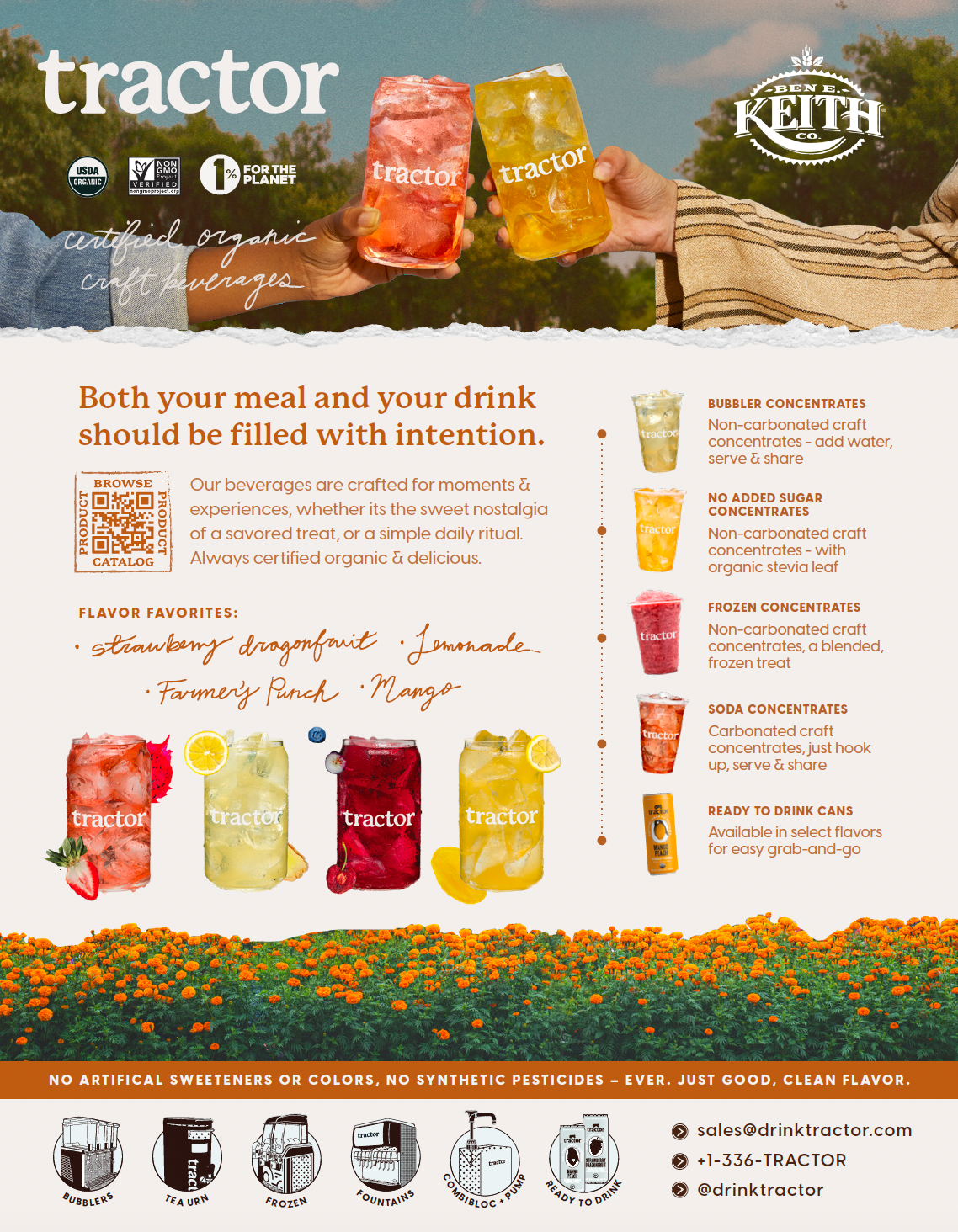 This downloadable Ben E Keith sell sheet highlights Tractor’s full portfolio and offerings of certified organic craft beverages – refreshing flavors made without artificial sweeteners, colors, or synthetic pesticides. Designed to showcase our full beverage portfolio and Ben E Keith distributor numbers.