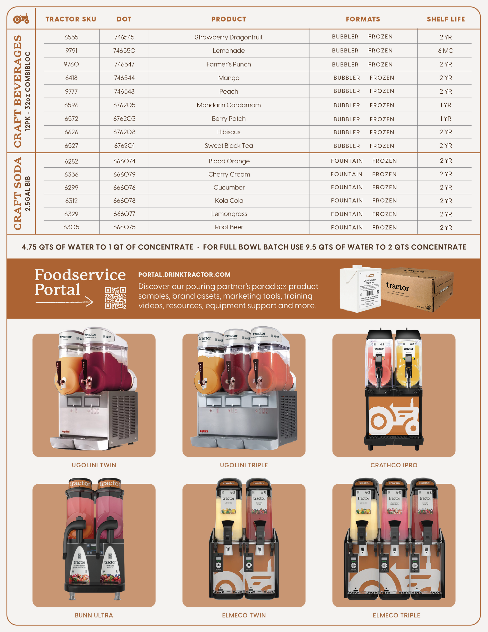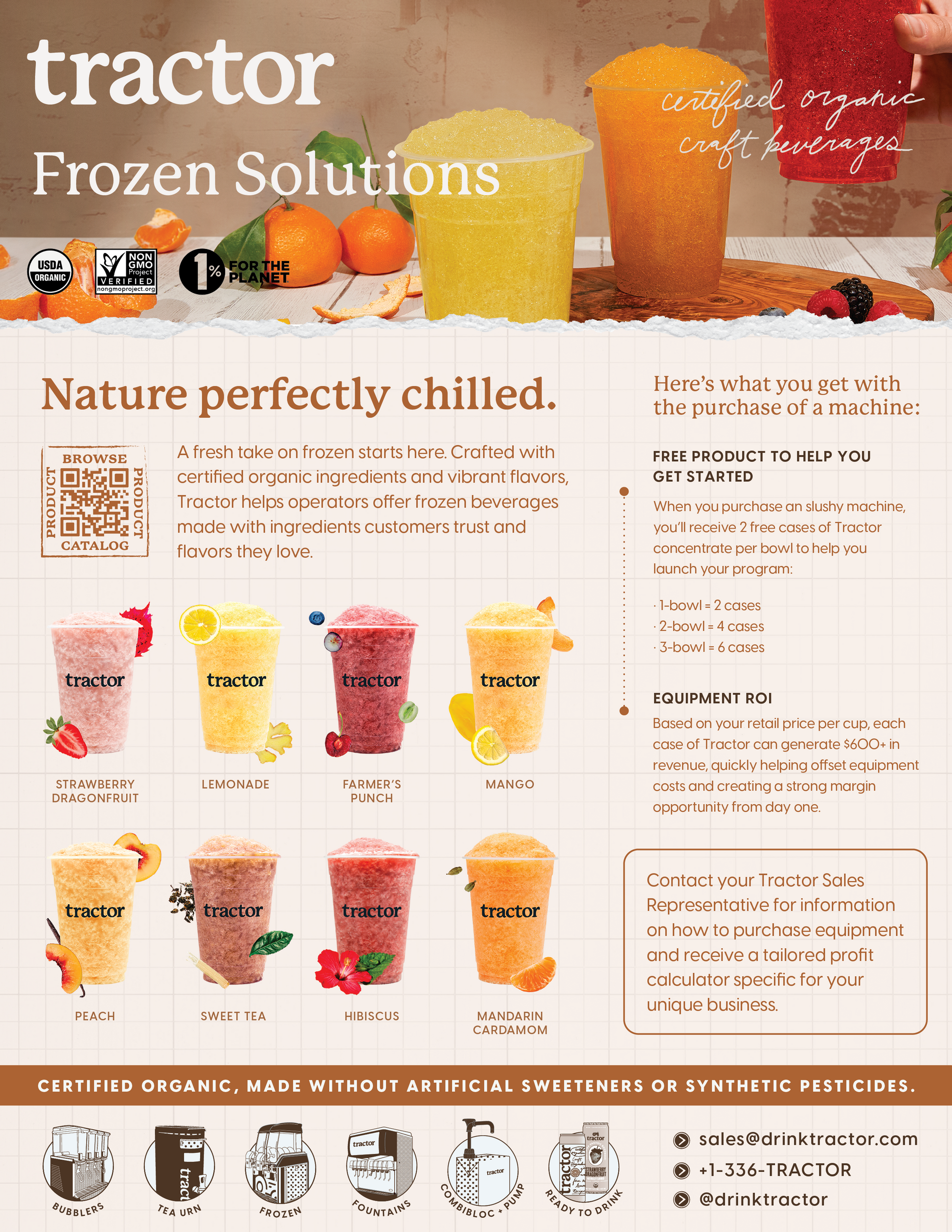 Bring vibrant flavor to frozen beverage programs with Tractor’s certified organic concentrates. Crafted with familiar ingredients and bold, fruit-forward flavors, Tractor helps operators serve refreshing frozen drinks guests trust and love.
