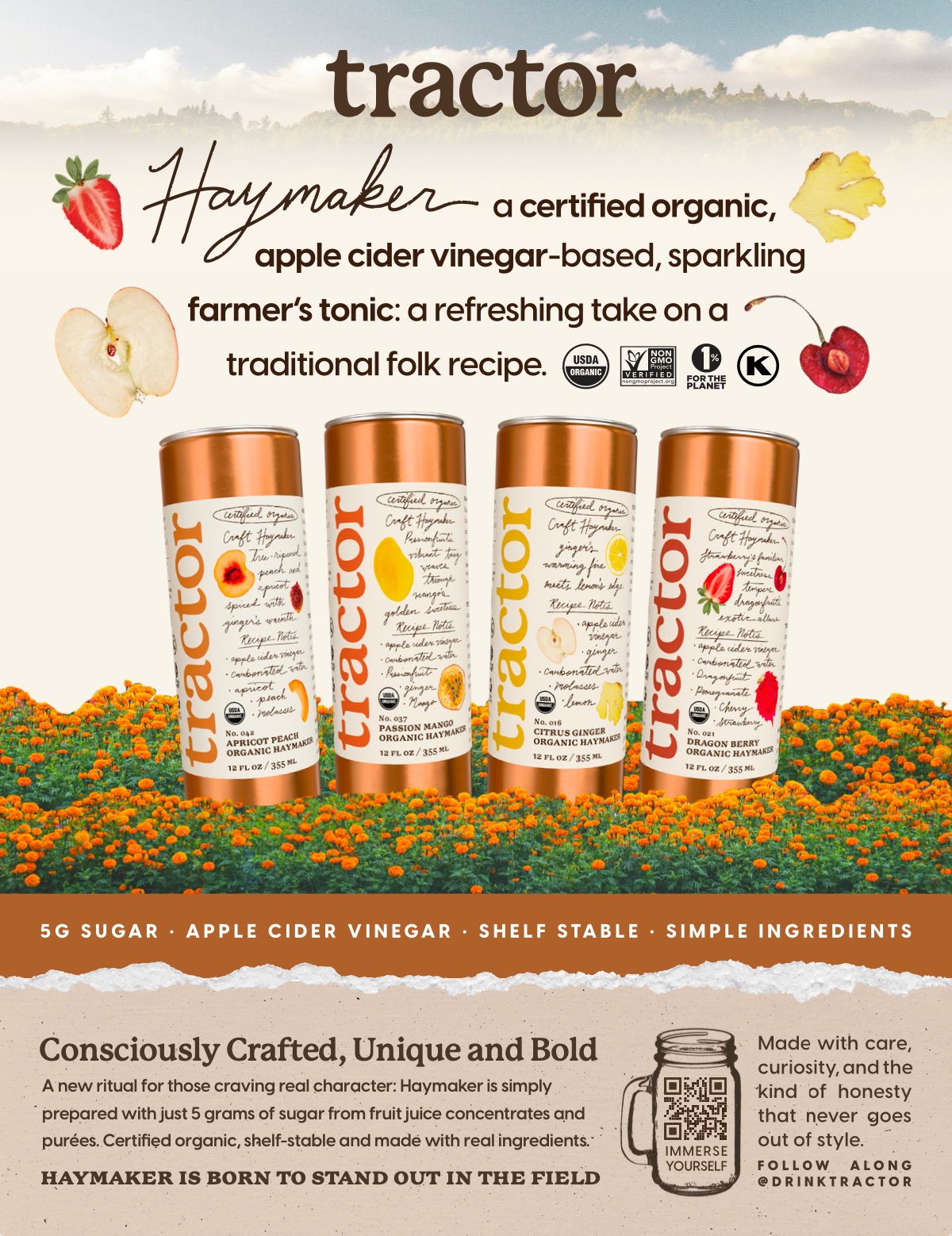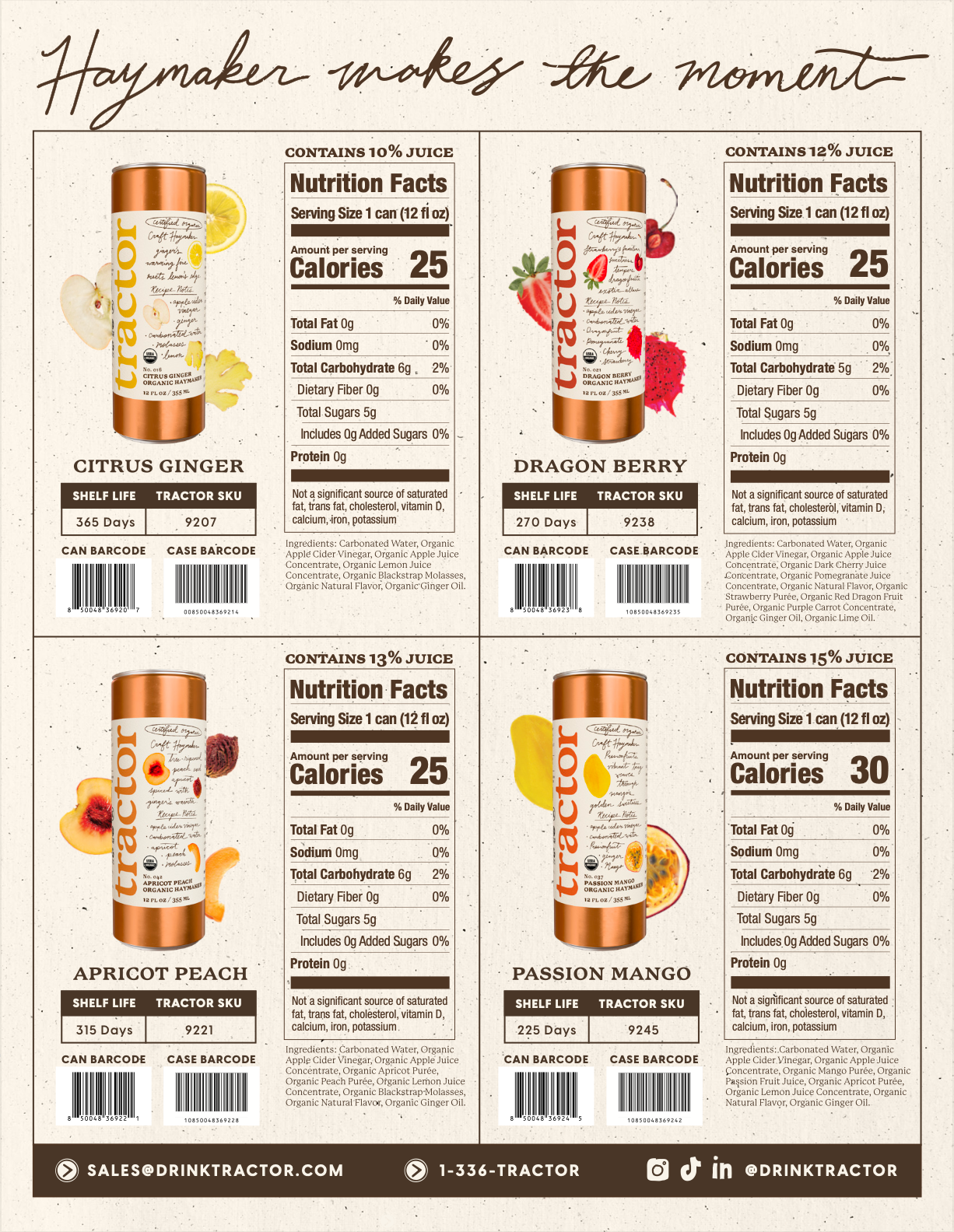 The generic sell sheet for Haymaker, Tractor’s certified organic, apple cider vinegar-based sparkling craft farmer’s tonic. With just 5g sugar, shelf-stable simplicity, and bold real-fruit flavors, Haymaker offers a refreshing twist on a traditional folk recipe.