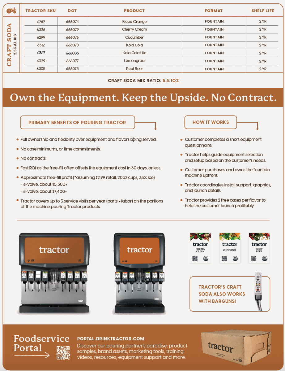 Stand out from traditional soda options with organic craft sodas that are exclusively designed for foodservice. Tractor organic sodas offer premium quality ingredients and flavors that stand out. Our sodas are built for profit and provide higher yield than traditional fountain soda. Fast ROI, no case minimums, time commitments, or contracts.
