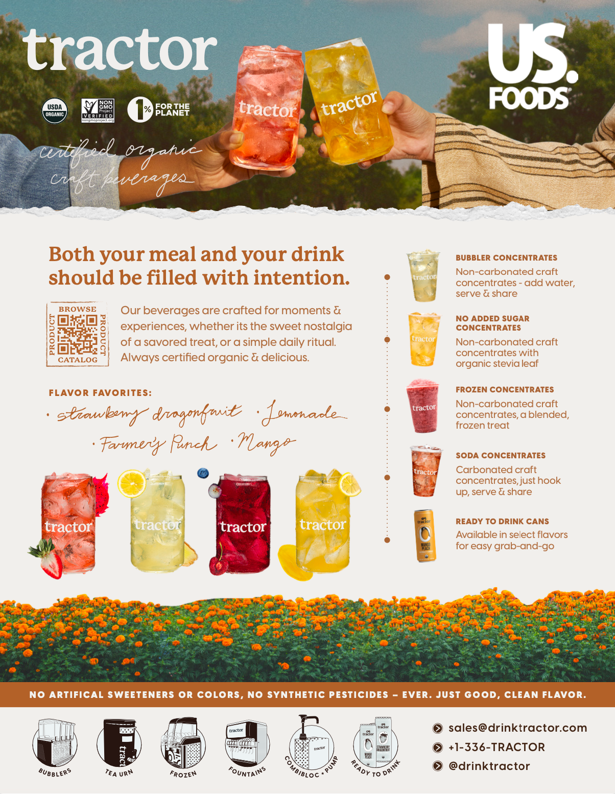 This downloadable US Foods sell sheet highlights Tractor’s full portfolio and offerings of certified organic craft beverages – refreshing flavors made without artificial sweeteners, colors, or synthetic pesticides. Designed to showcase our full beverage portfolio and US Foods distributor numbers.